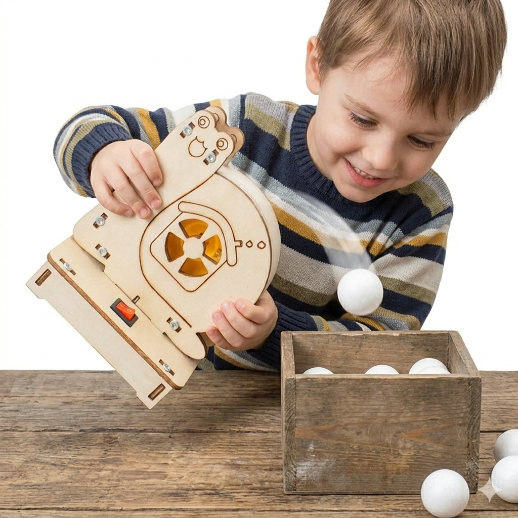 استخدم منفاخ برنولي لرفع كرة الفوم وتوجيهها حتى تسقط داخل دلو أو صندوق.
